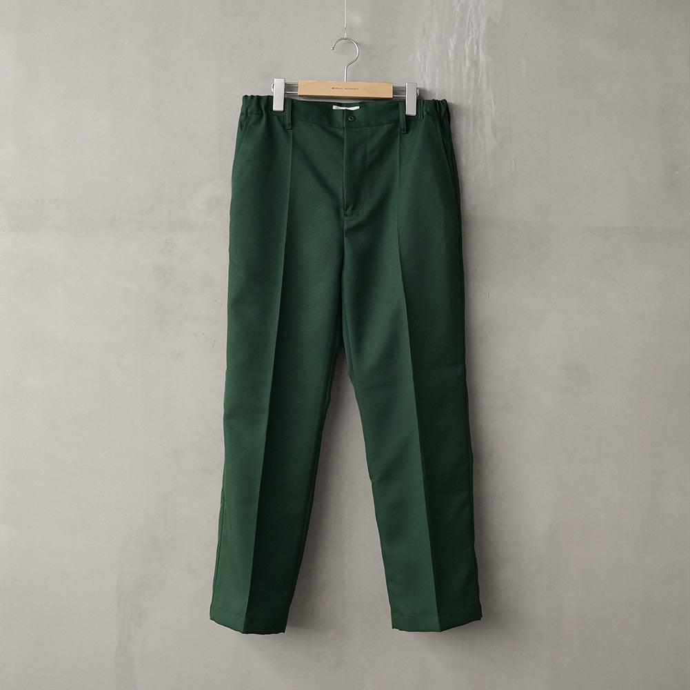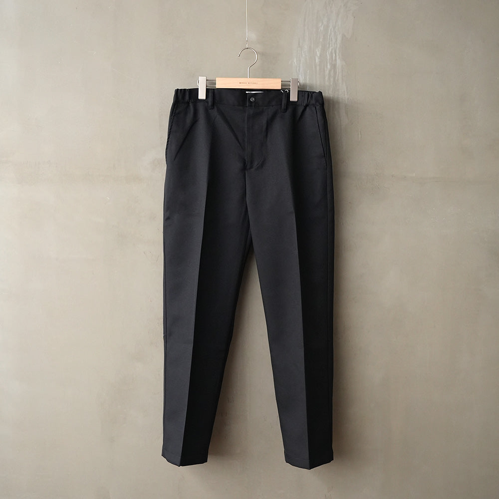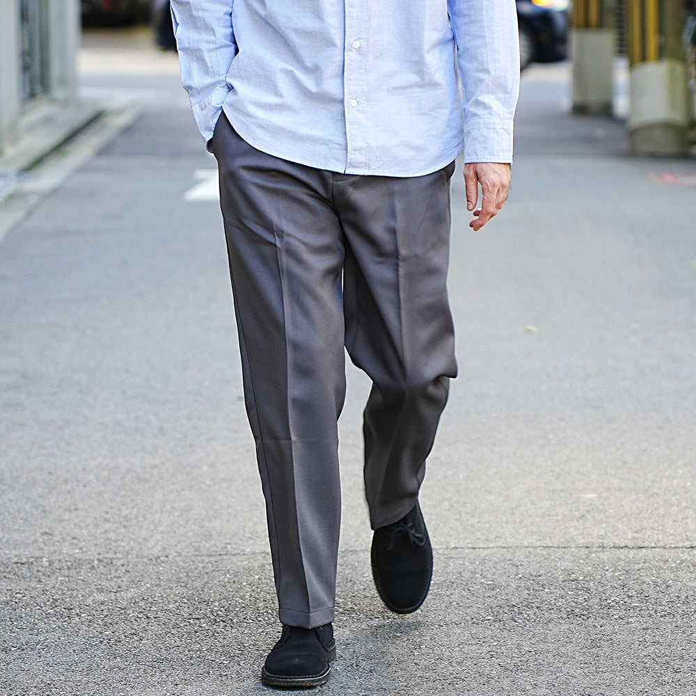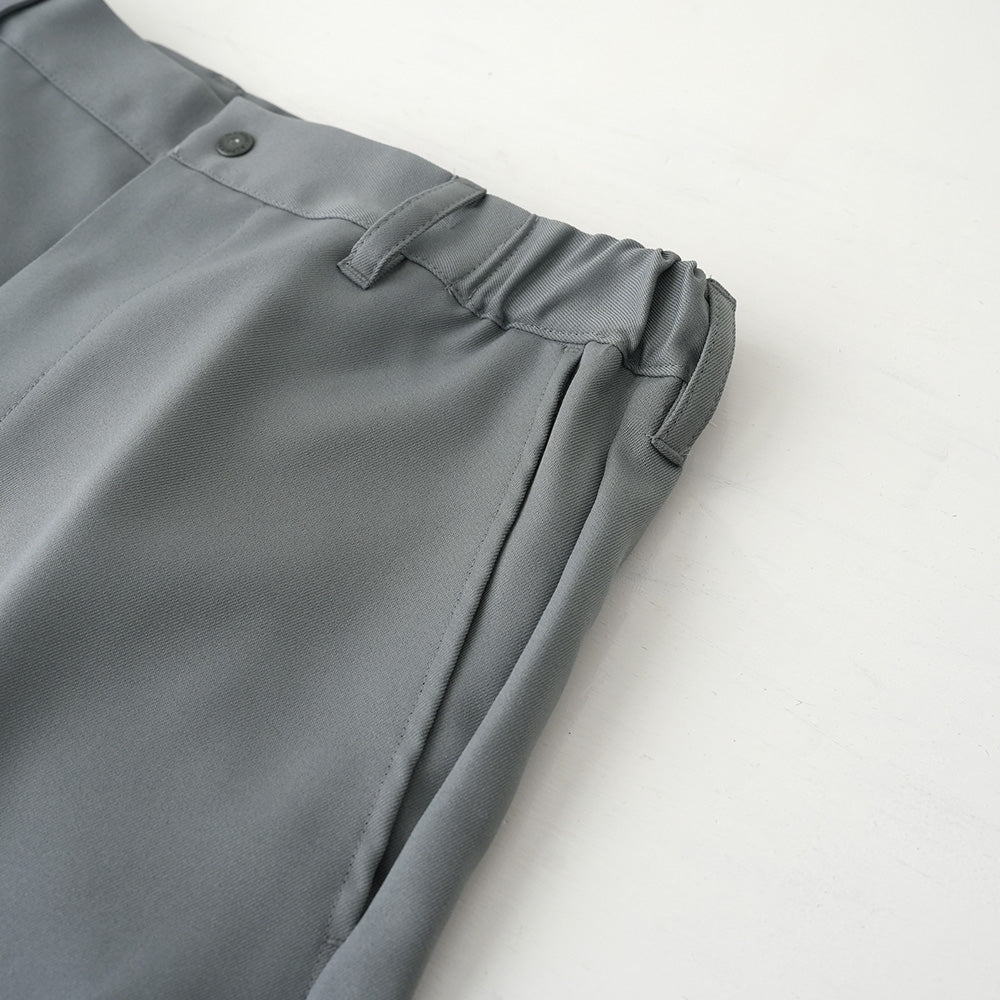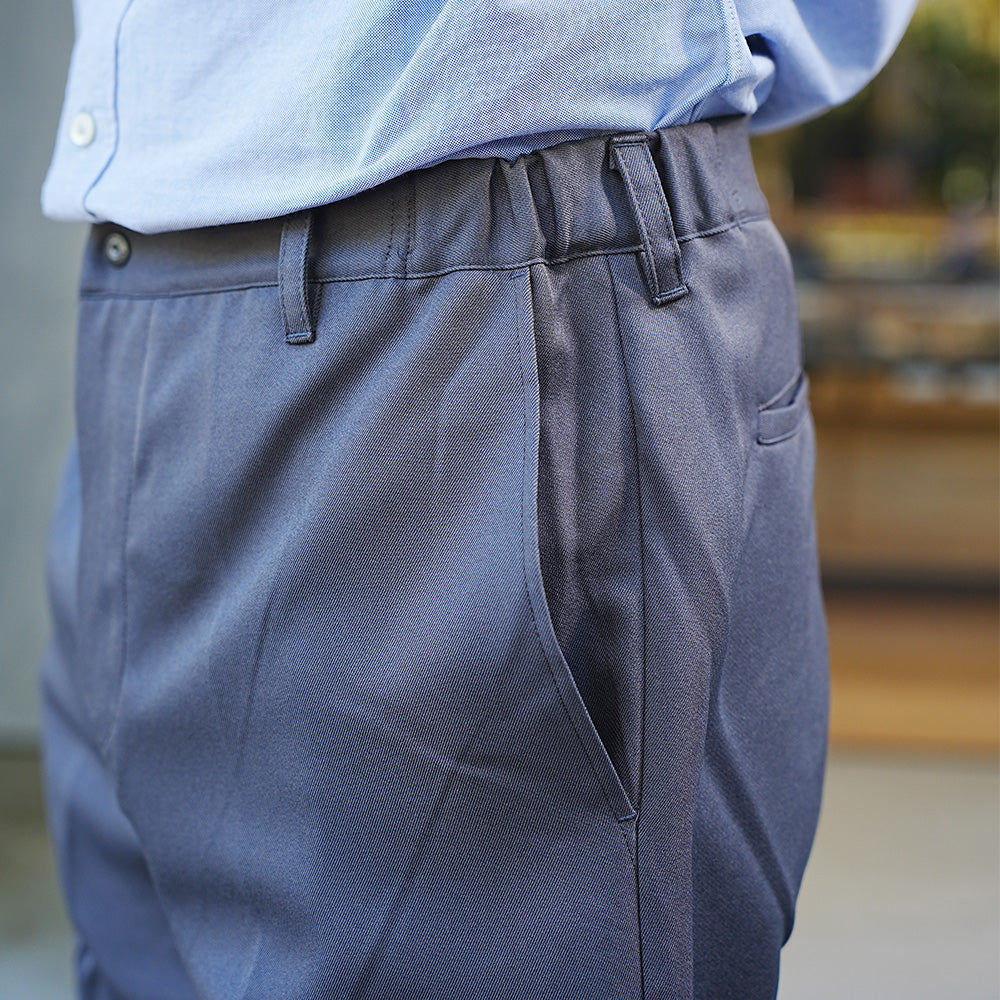 両サイドにゴムを配し、ベルトなしでも着用可能なリラックス感を持ちながら、センタープレス入りでスラックスのような端正な印象に仕上げています。