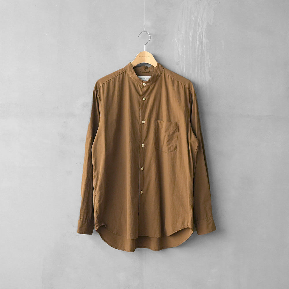 近江晒と反発樹脂加工を組み合わせた、表情豊かな50ブロードを使用したバンドカラーシャツ。