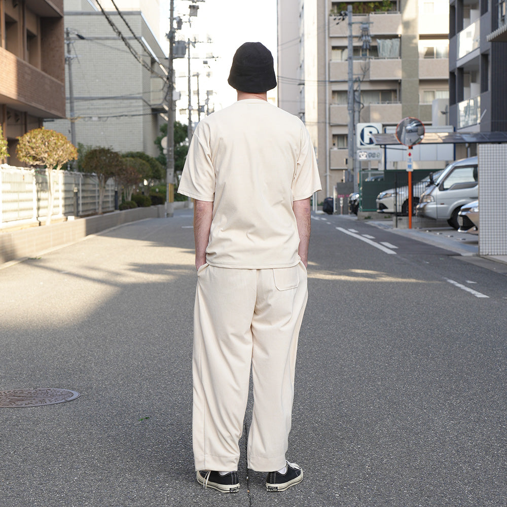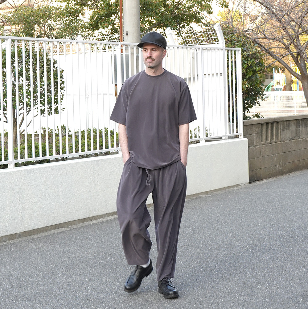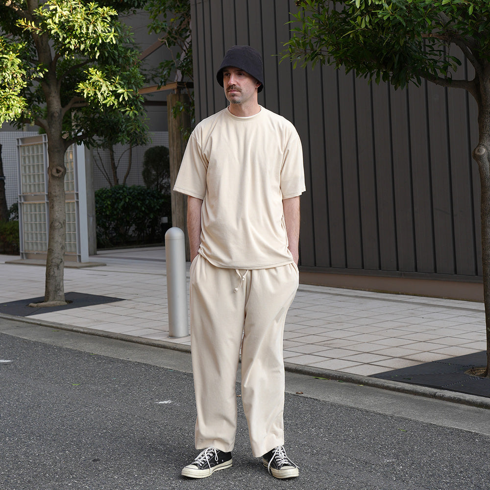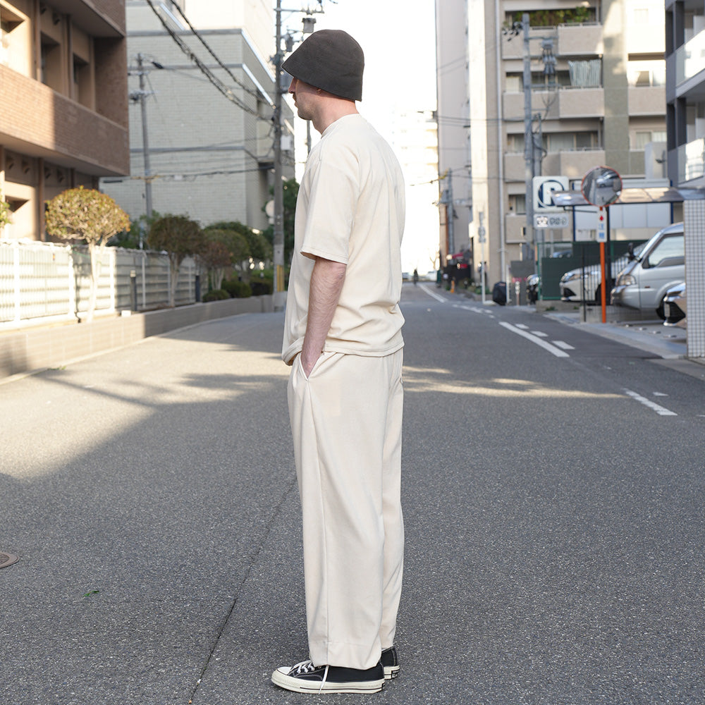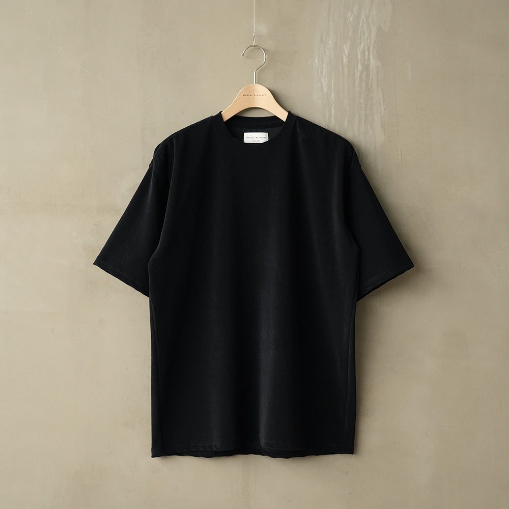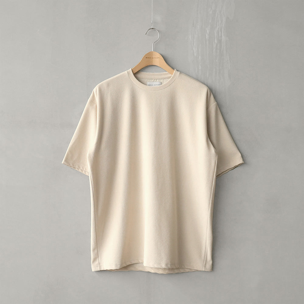 A short-sleeved T-shirt made from compactly knitted high-gauge pile fabric. Utilizing the characteristics of knitting machines designed for