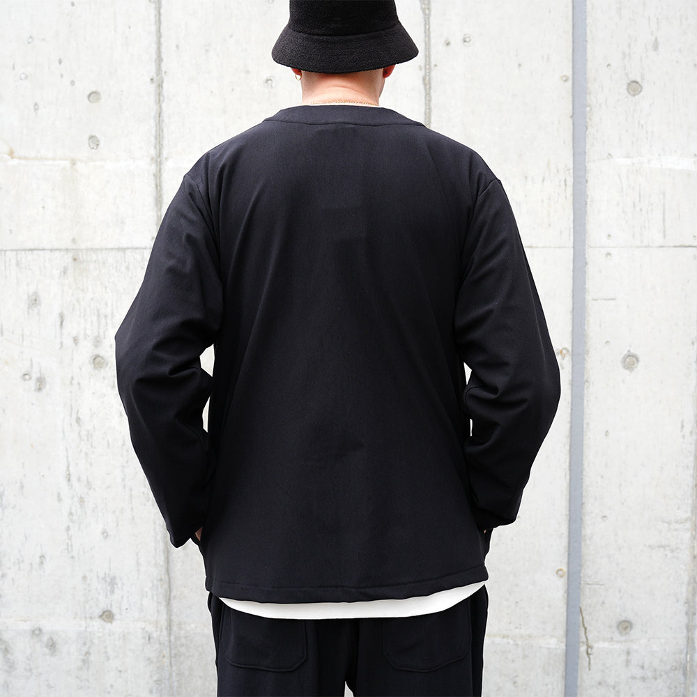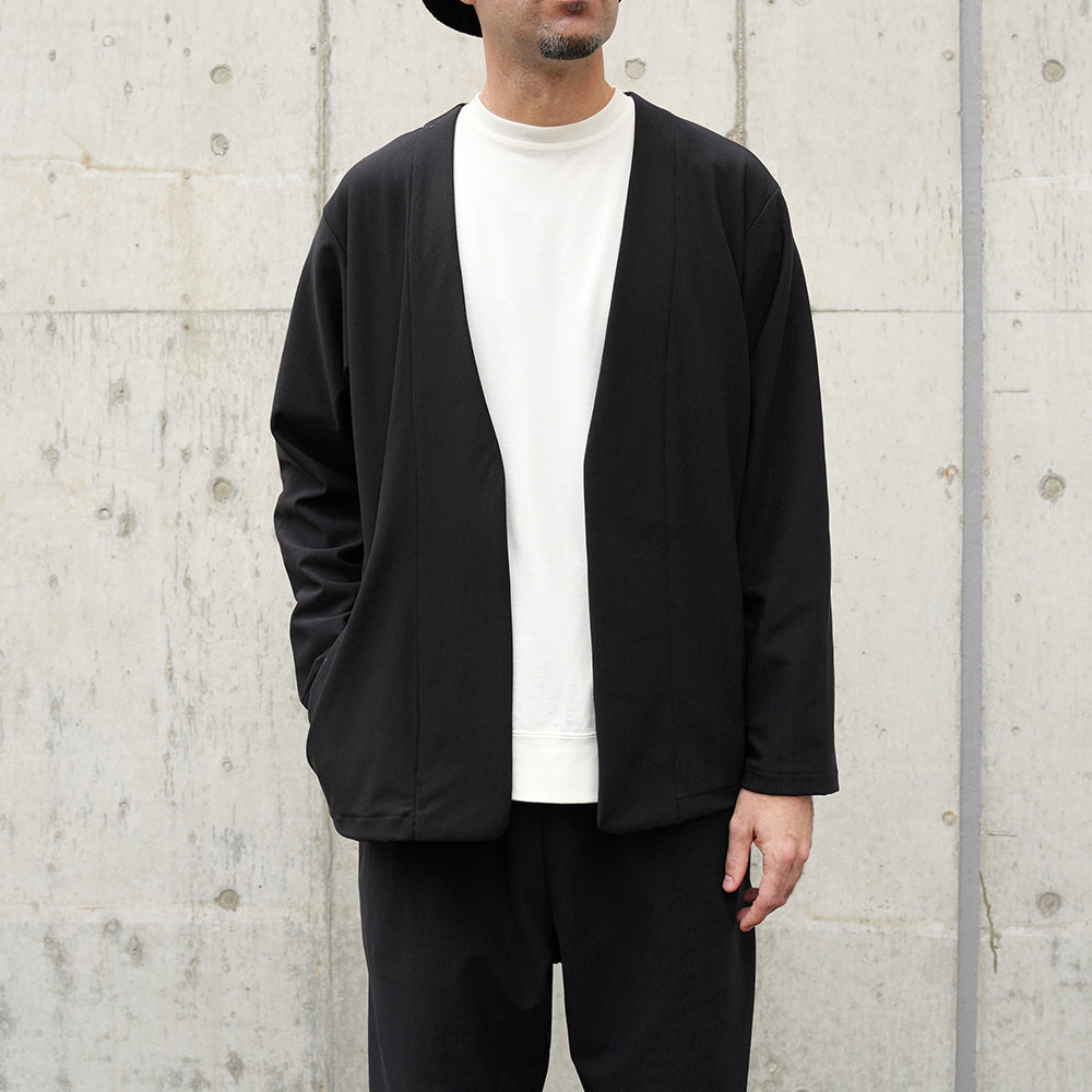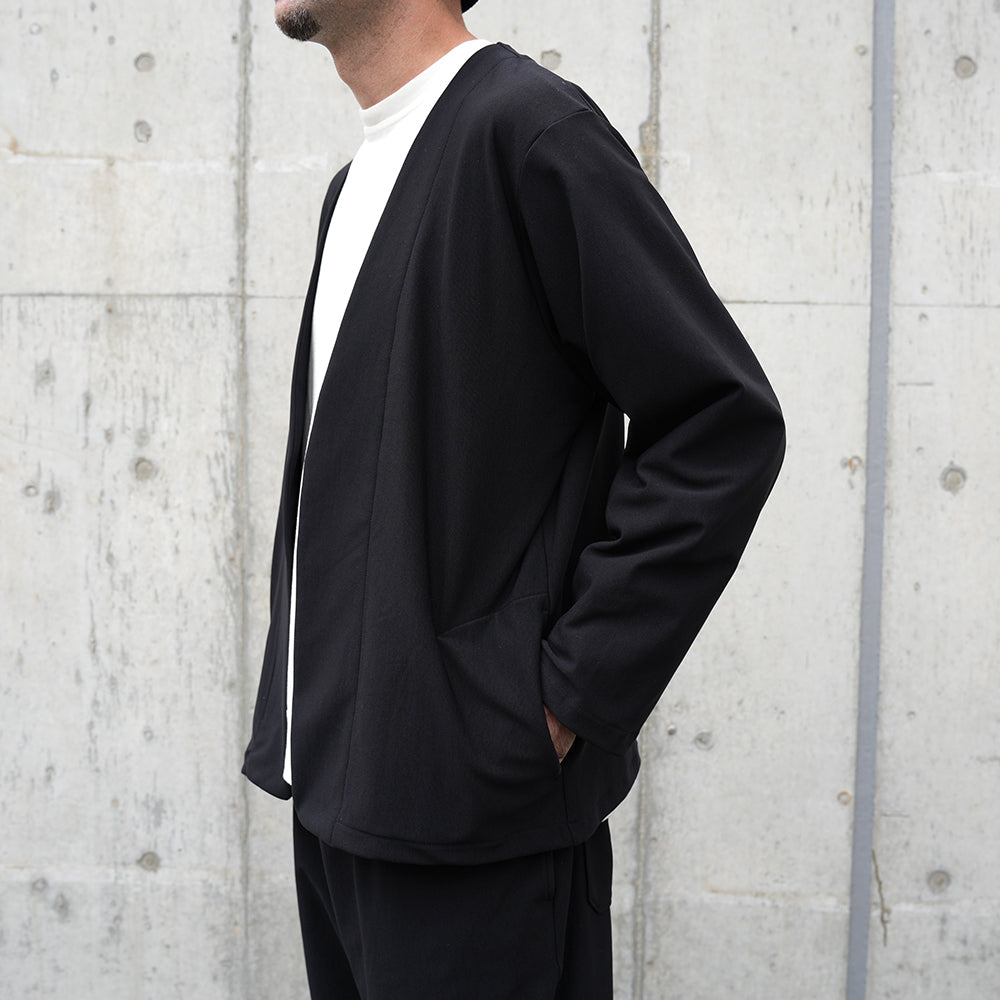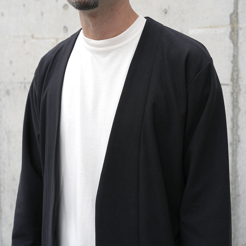 発熱する特殊な機能ジャージー素材LEOTHERMO®を使用した裏起毛ジャージー素材のカーディガン。