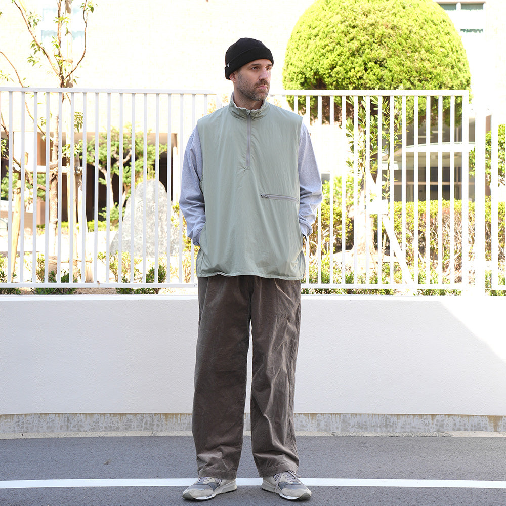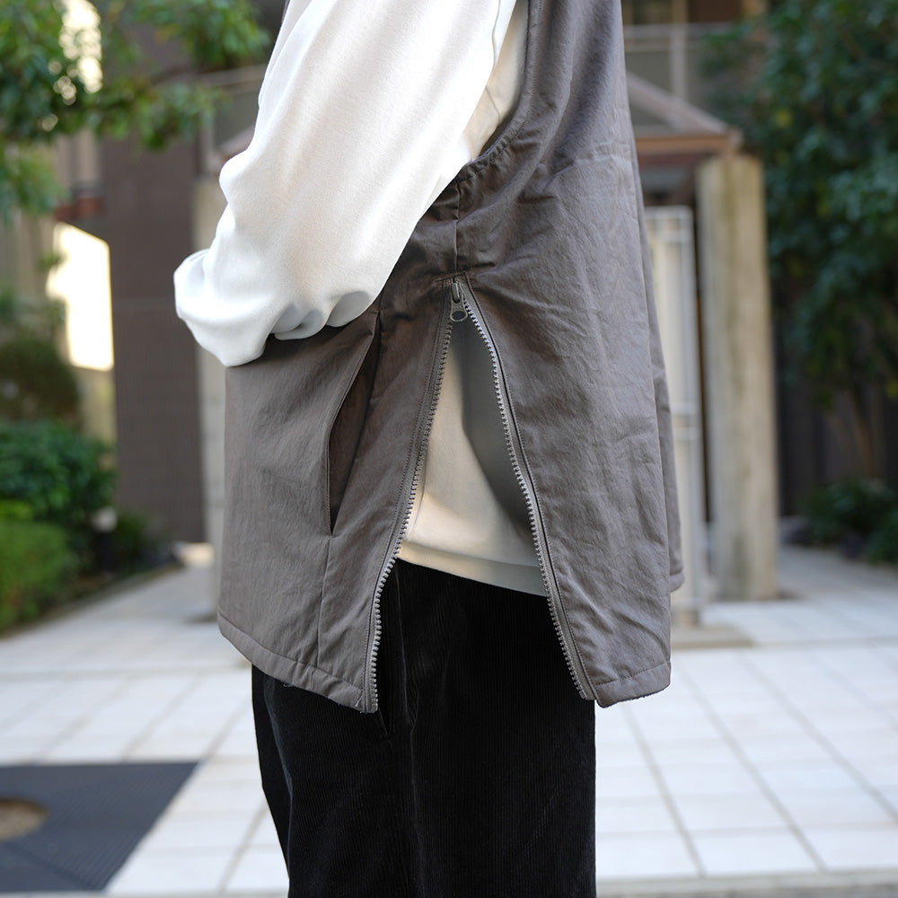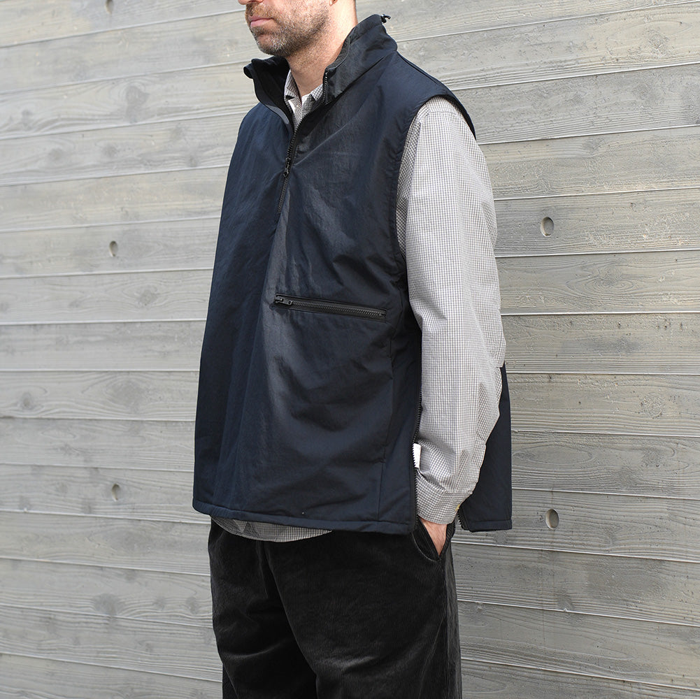 A cotton/nylon twill pullover vest. It features a generous width and armholes, and is sized to be worn over sweatshirts and knitwear, as well as