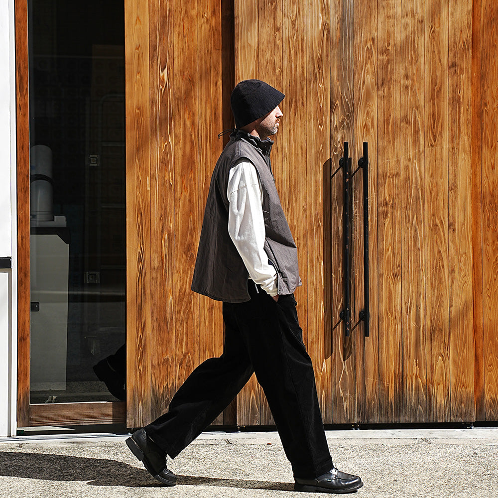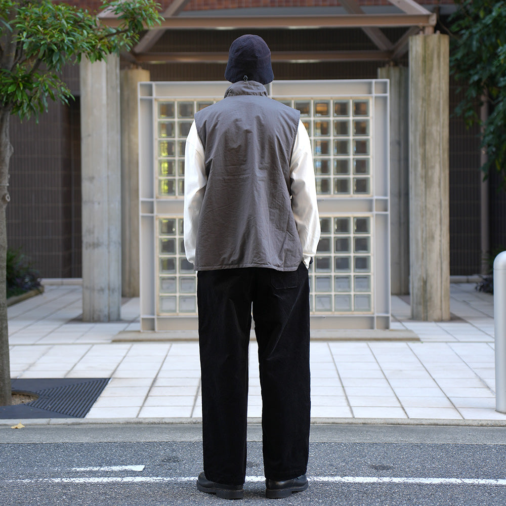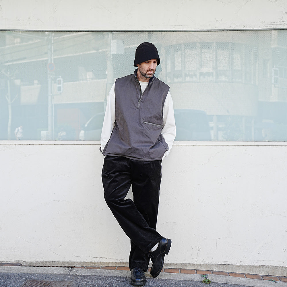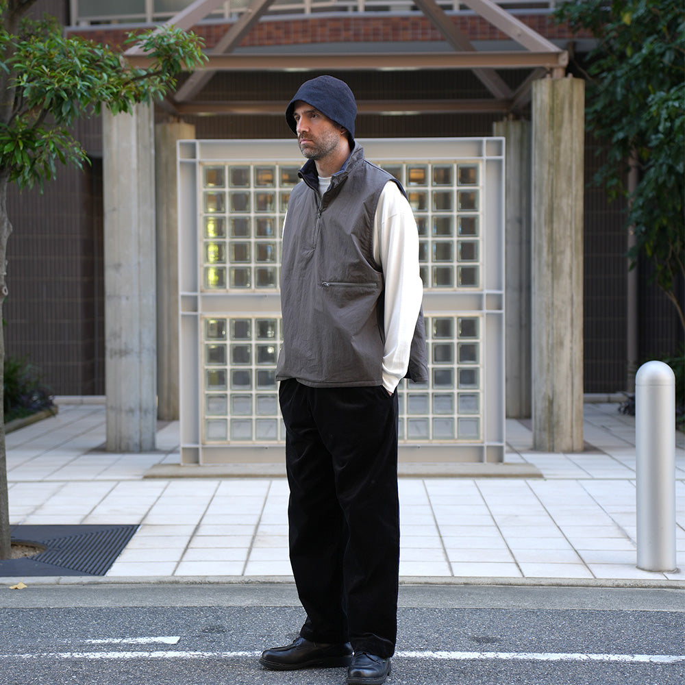 A cotton/nylon twill pullover vest. It features a generous width and armholes, and is sized to be worn over sweatshirts and knitwear, as well as