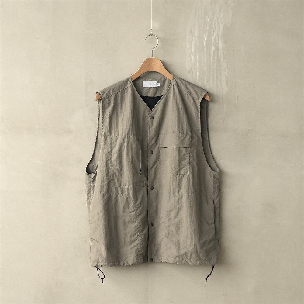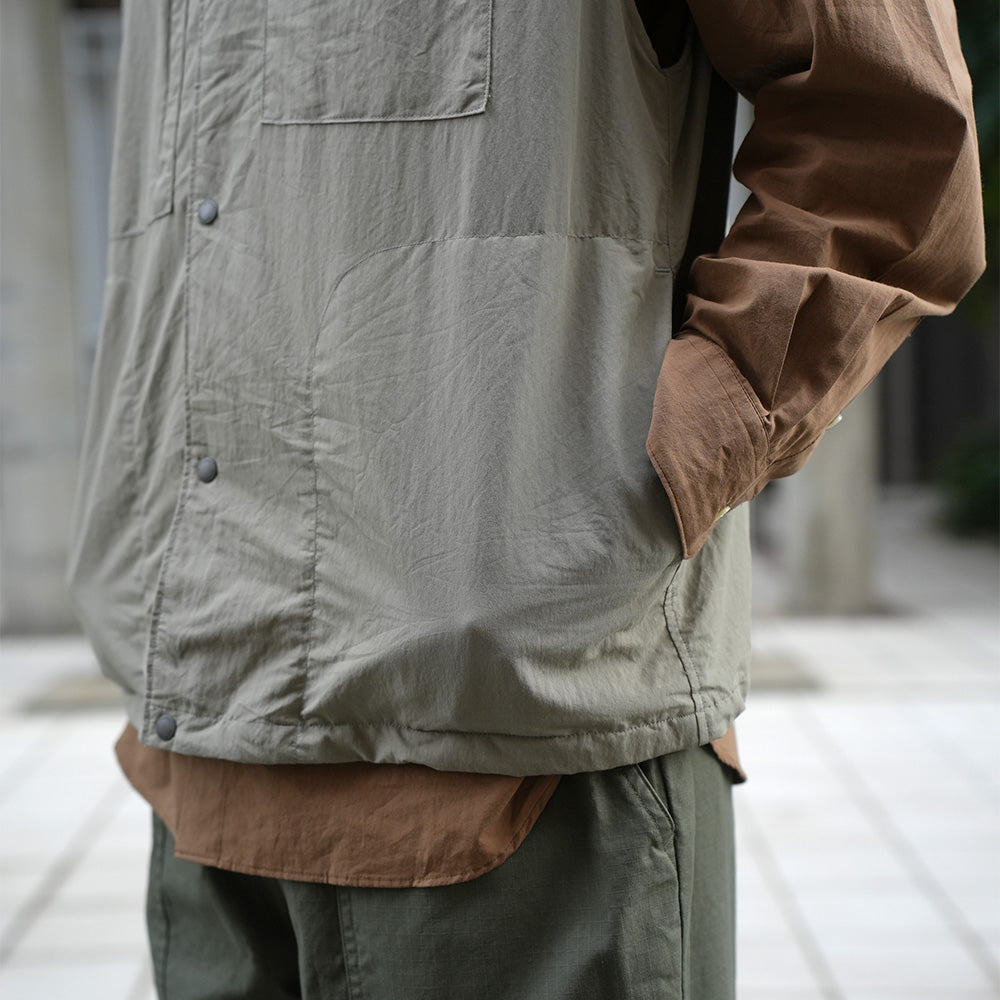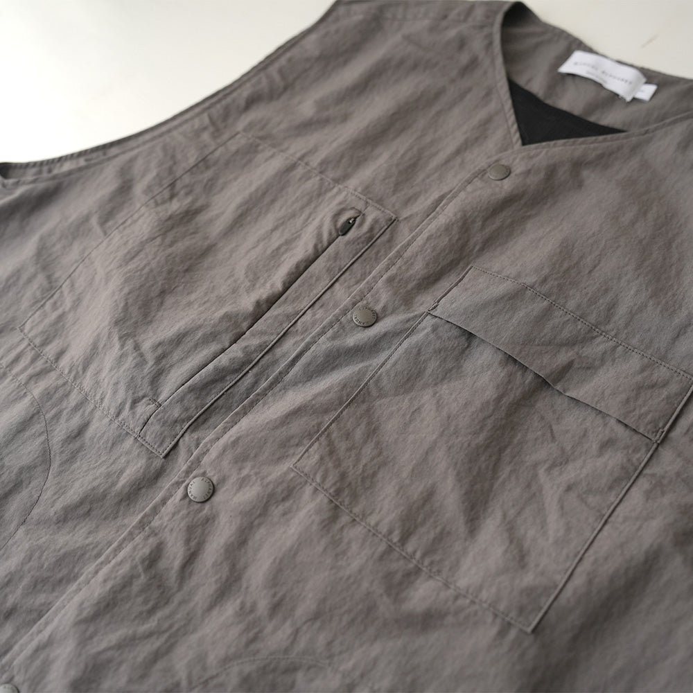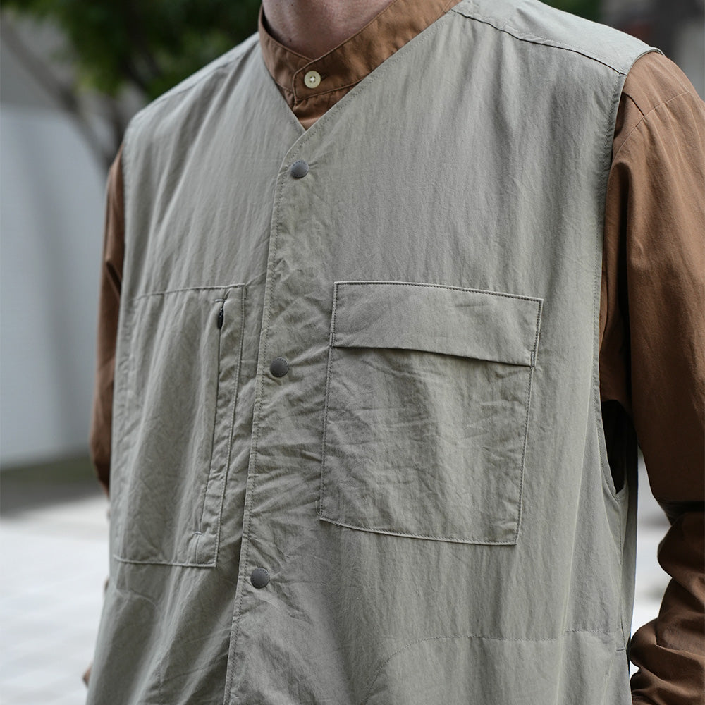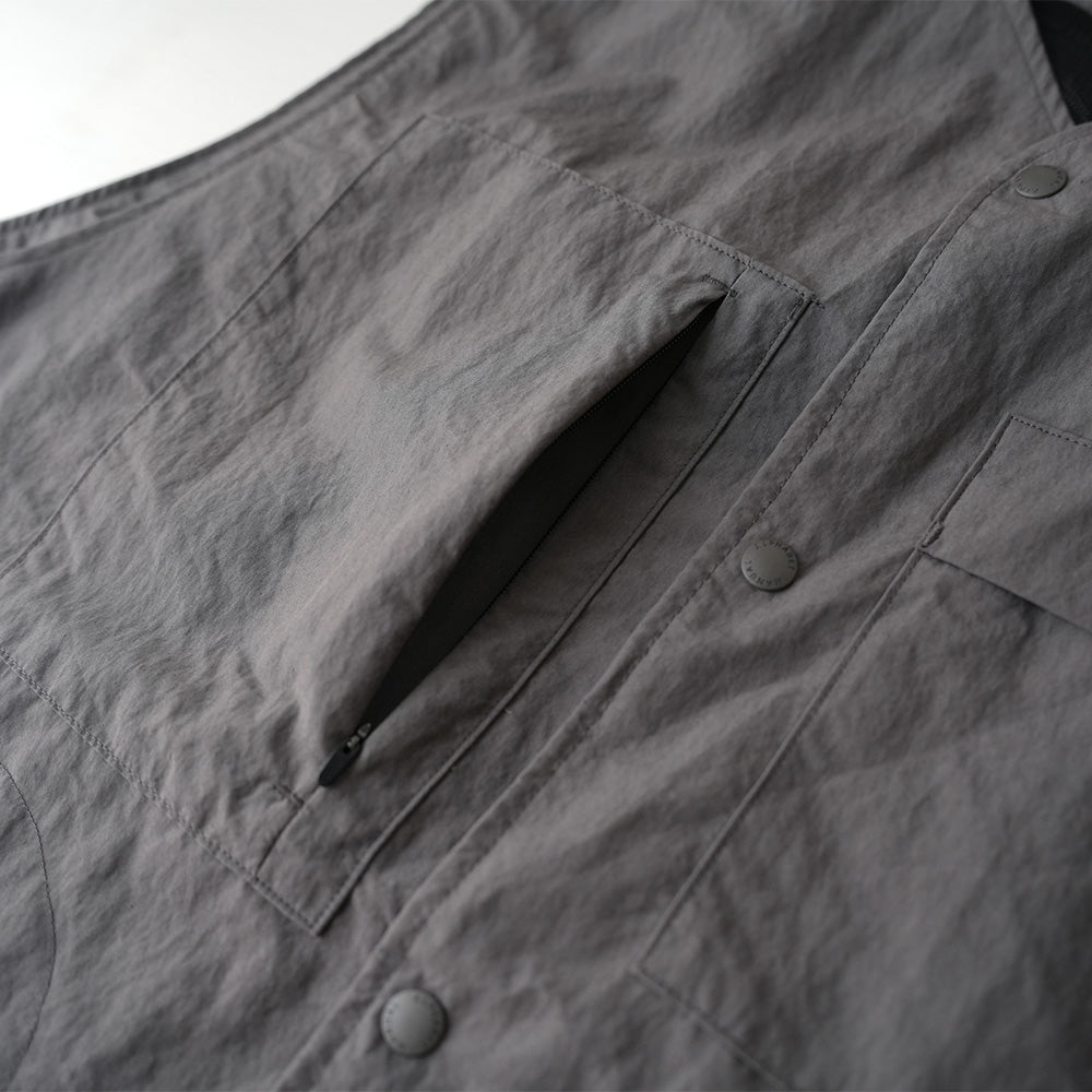 メッシュ裏地の総裏仕立てで、浅めのVネック、両脇にシームポケット、胸には非対称ポケットを配し、アウトドアやミリタリーの要素を感じさせるディテールに仕上げました。