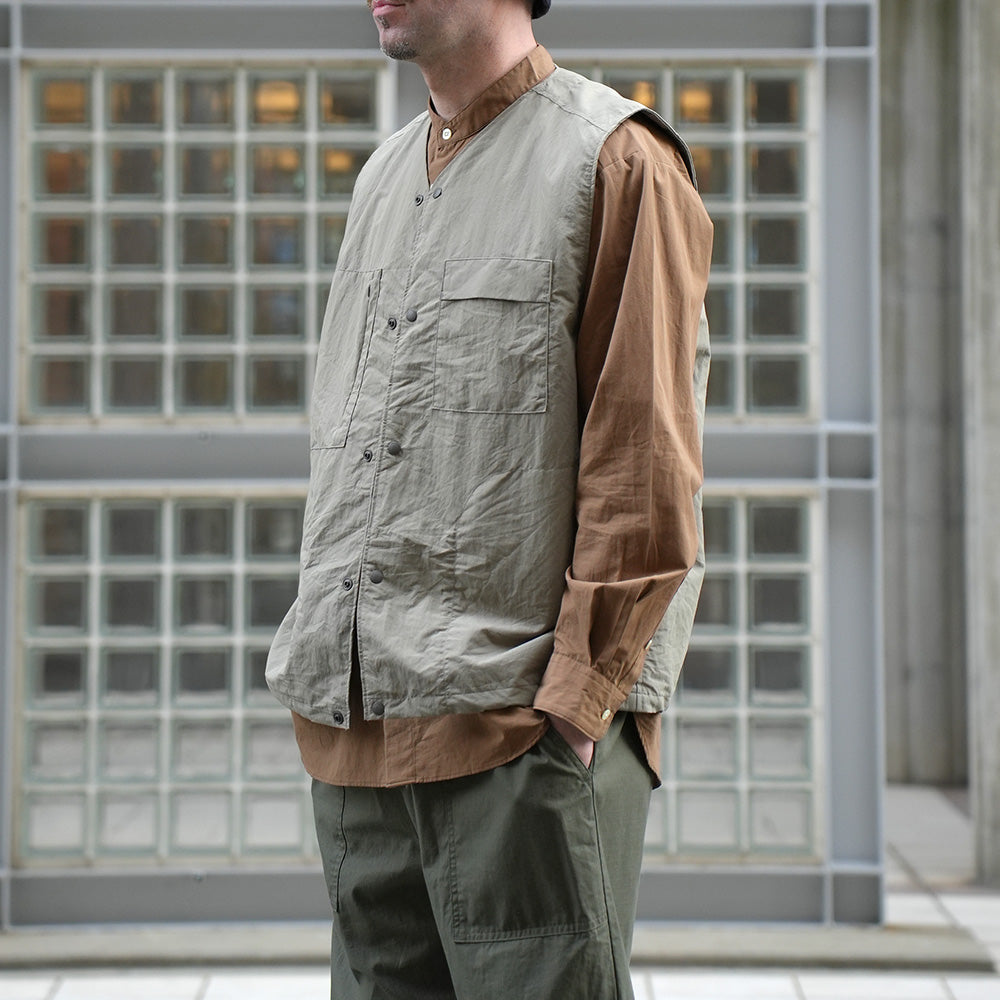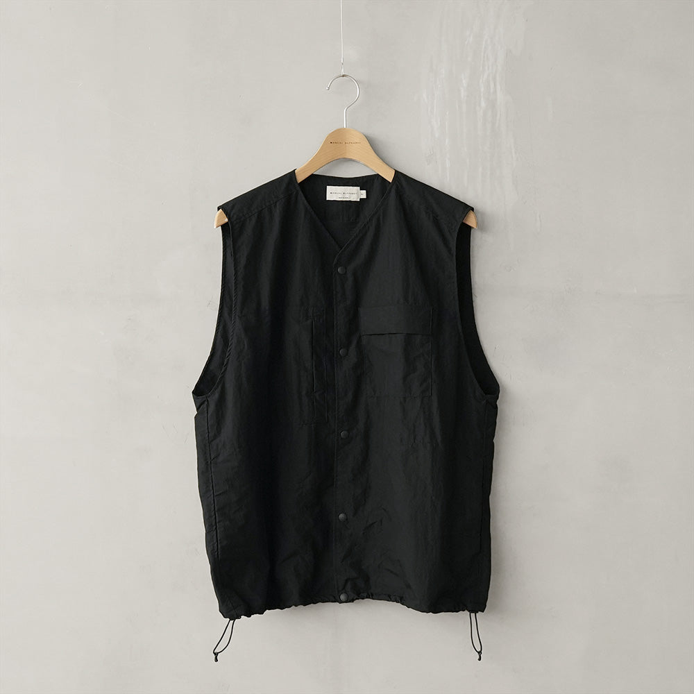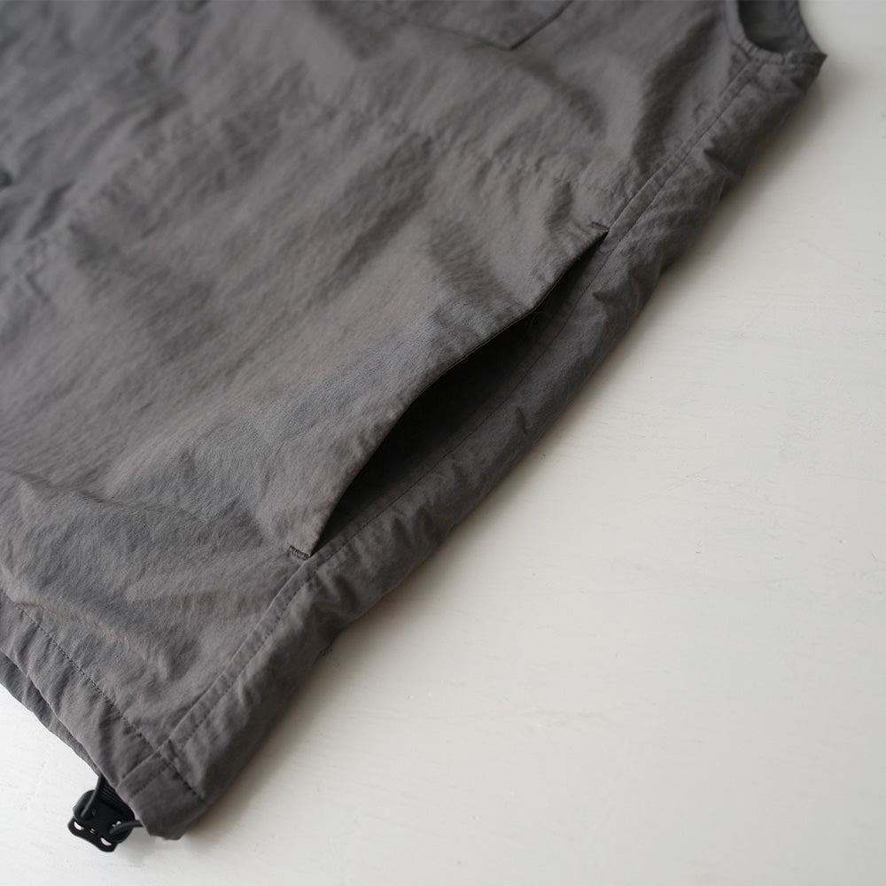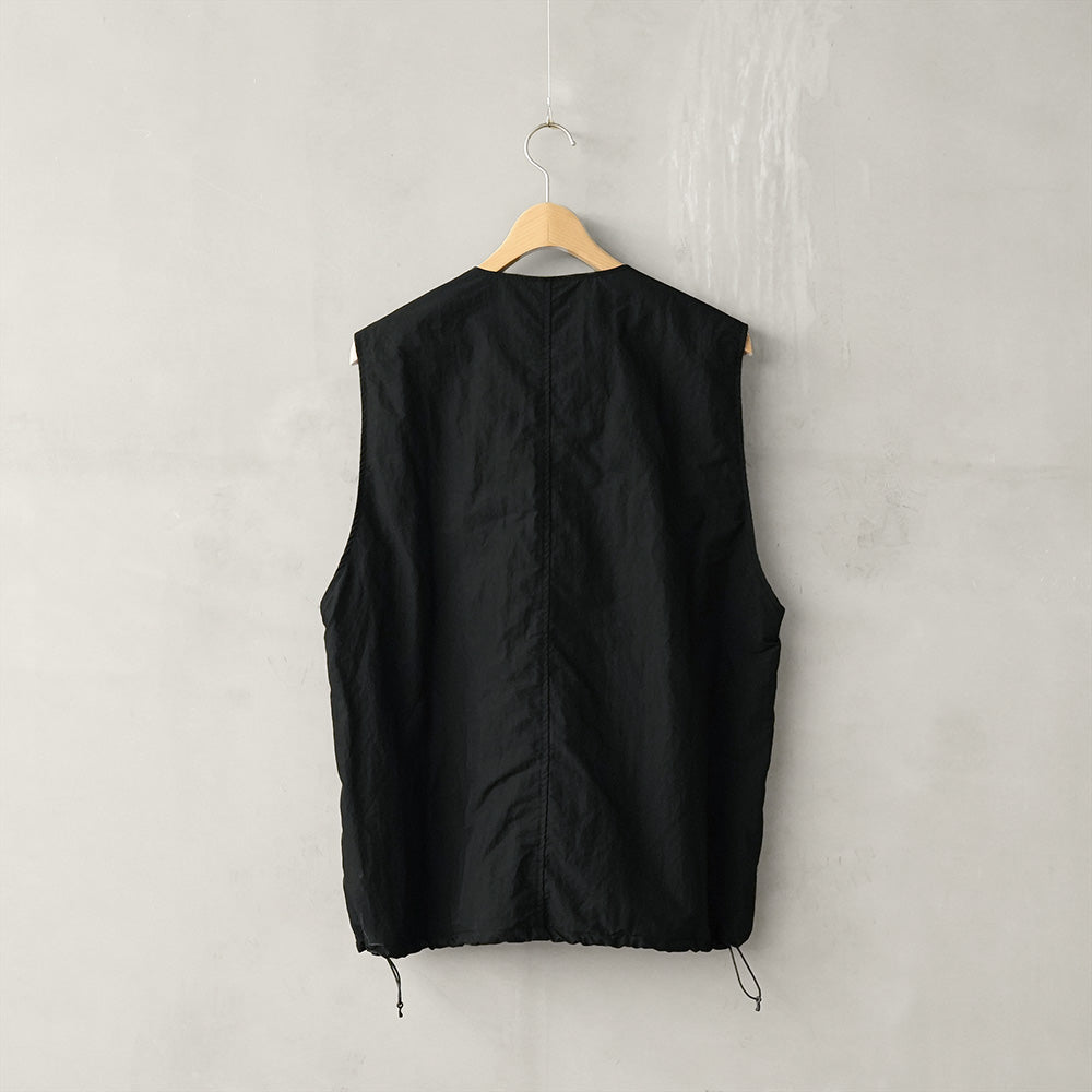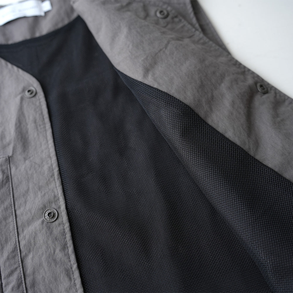 メッシュ裏地の総裏仕立てで、浅めのVネック、両脇にシームポケット、胸には非対称ポケットを配し、アウトドアやミリタリーの要素を感じさせるディテールに仕上げました。