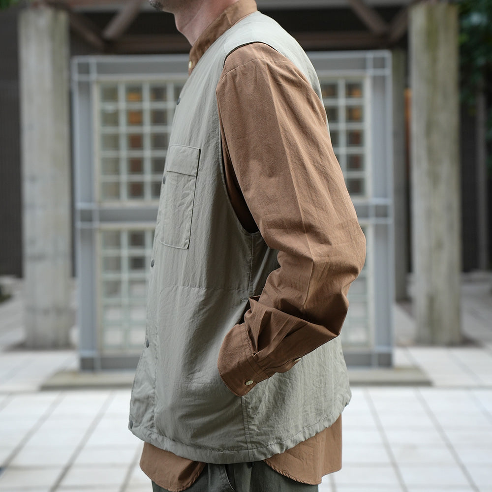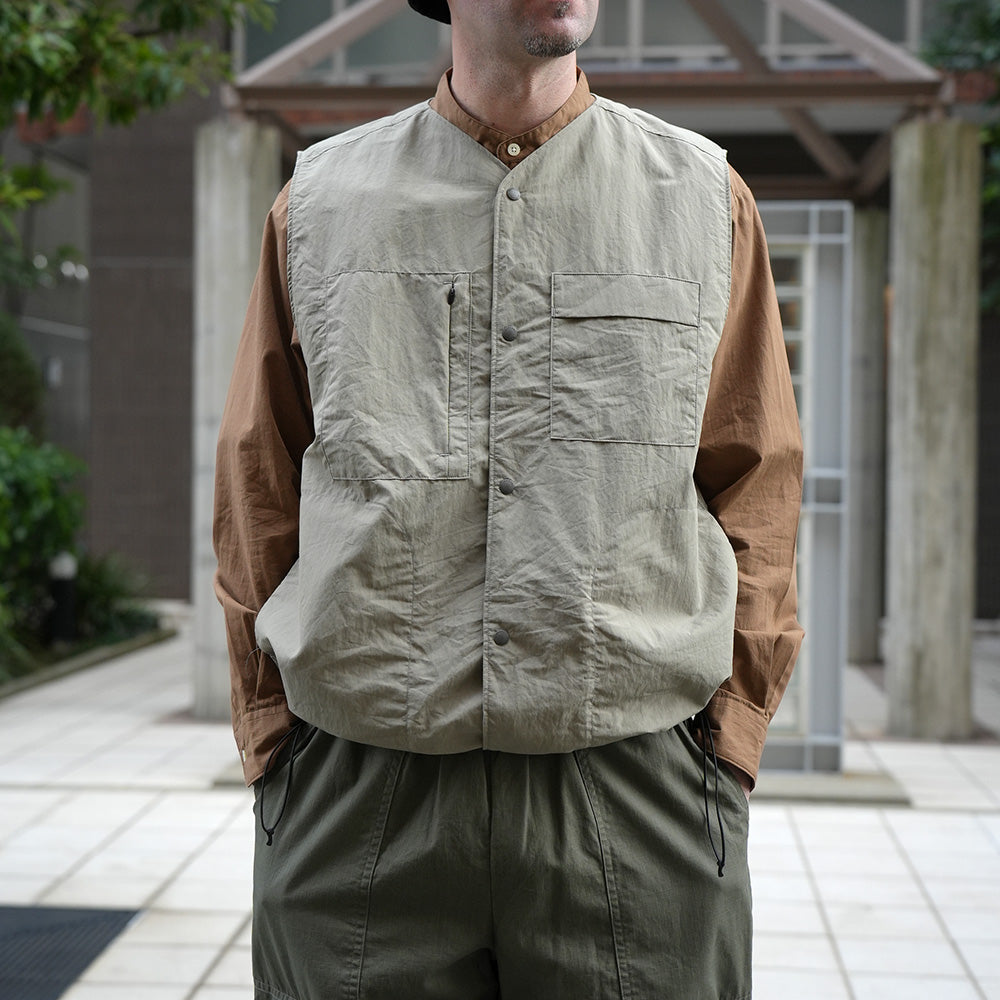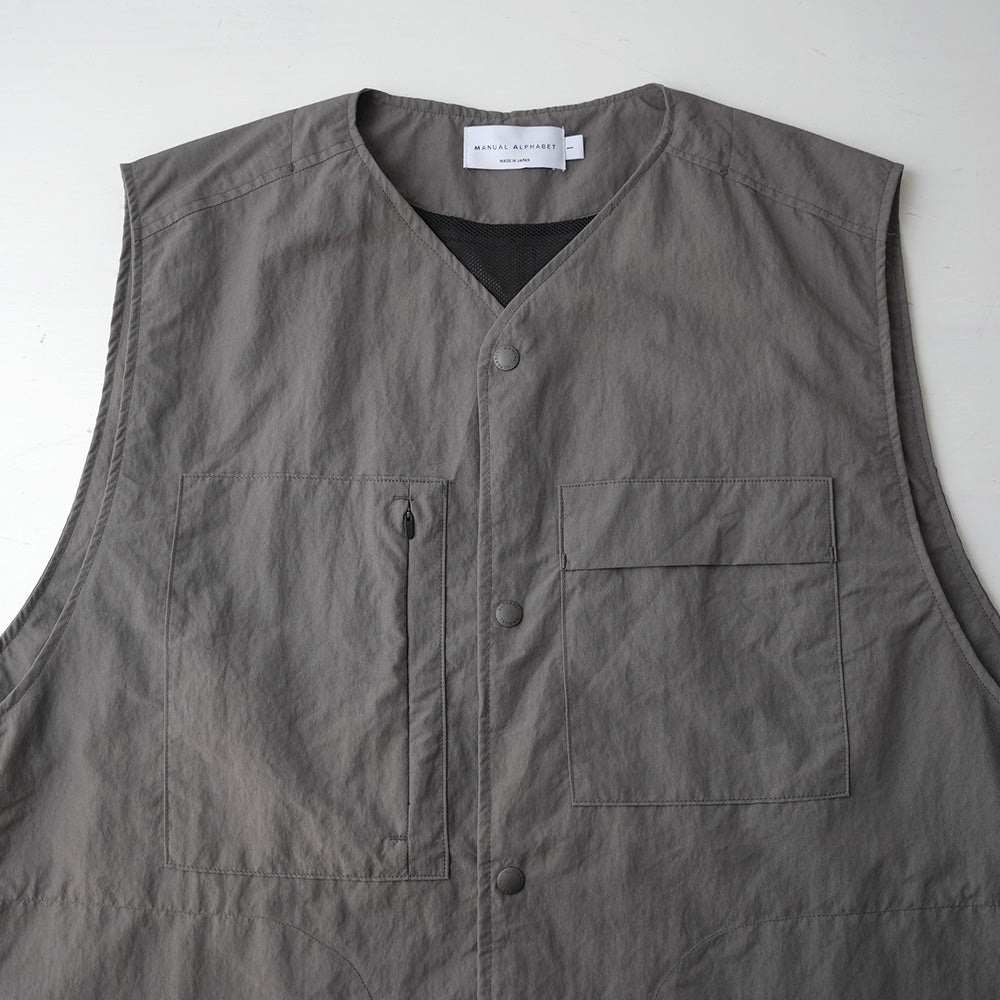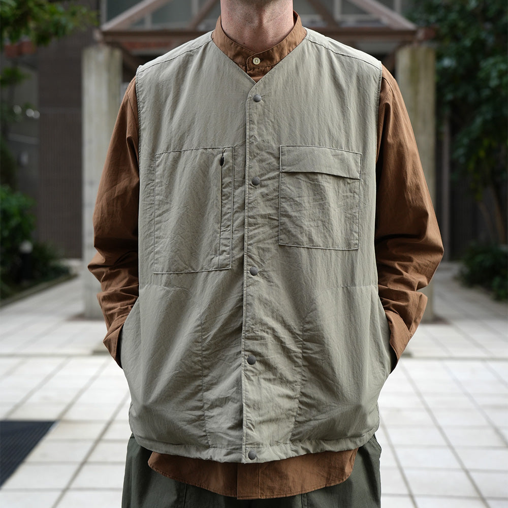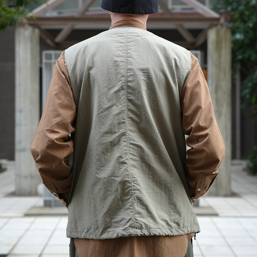 メッシュ裏地の総裏仕立てで、浅めのVネック、両脇にシームポケット、胸には非対称ポケットを配し、アウトドアやミリタリーの要素を感じさせるディテールに仕上げました。