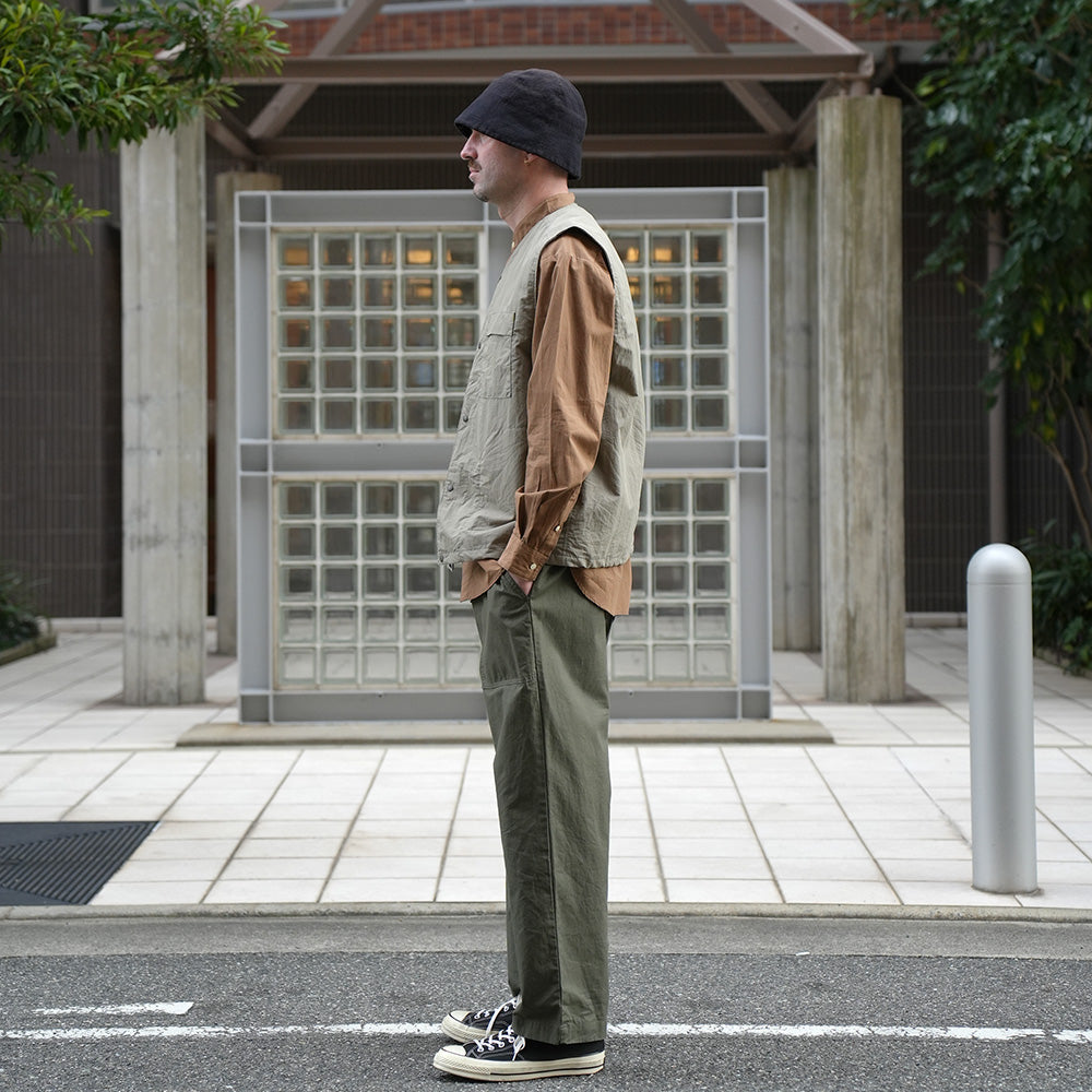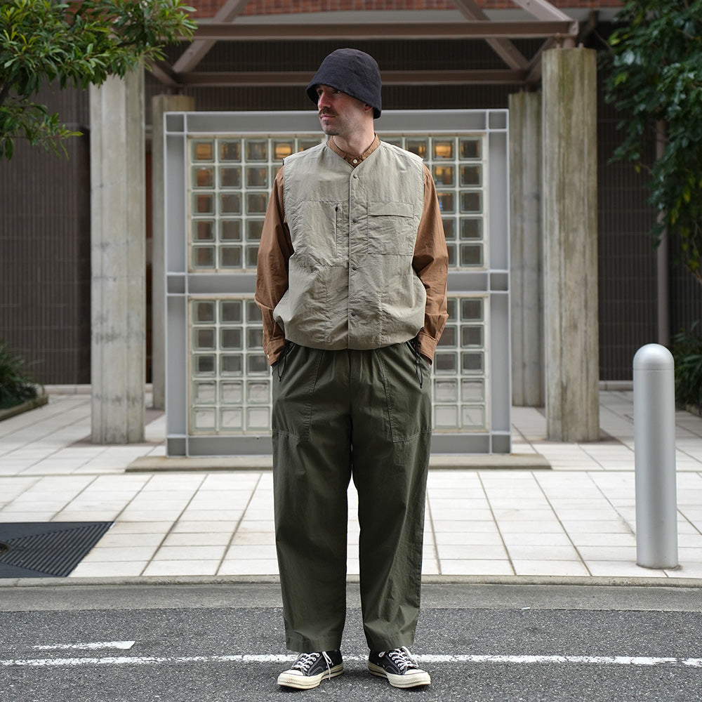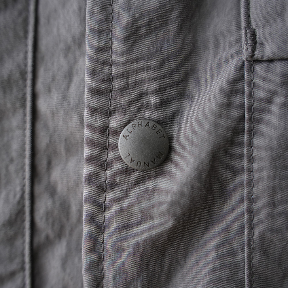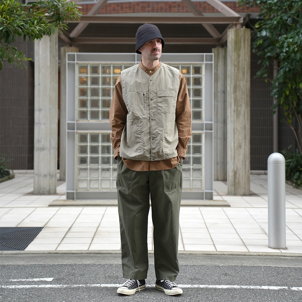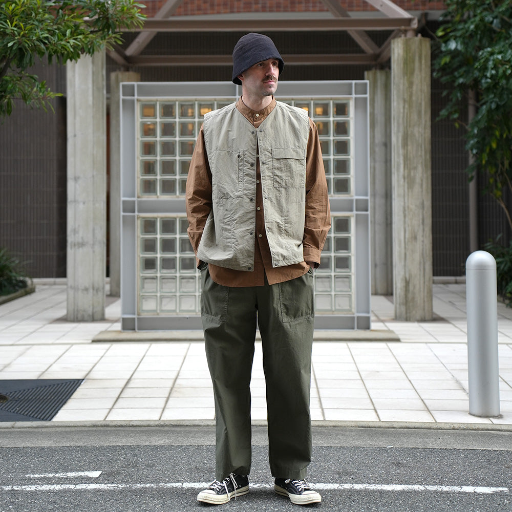メッシュ裏地の総裏仕立てで、浅めのVネック、両脇にシームポケット、胸には非対称ポケットを配し、アウトドアやミリタリーの要素を感じさせるディテールに仕上げました。