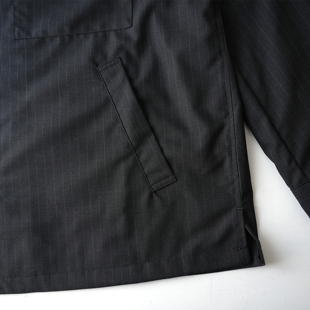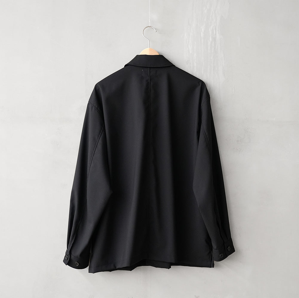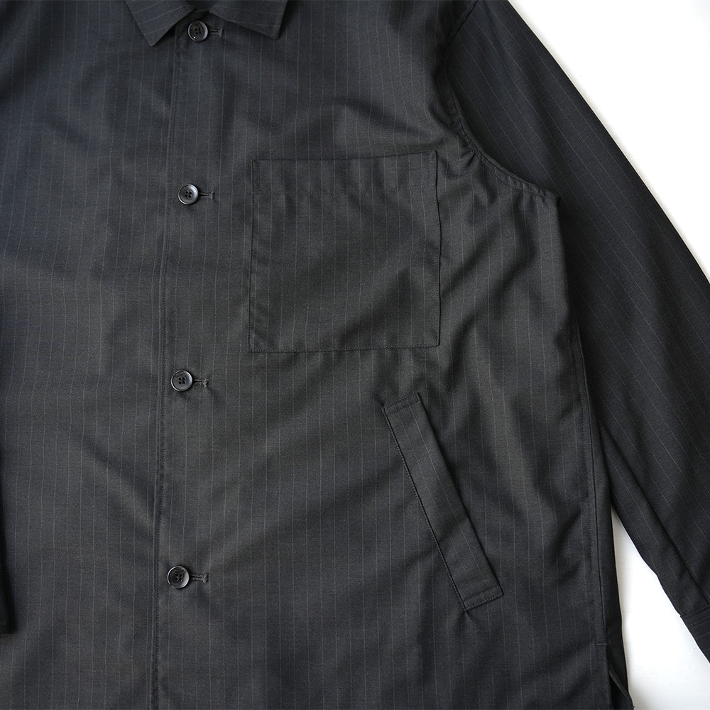 Coverall jacket made from T/W/R stretch tro material. Based on a French work jacket, the waist pockets have been rearranged into box