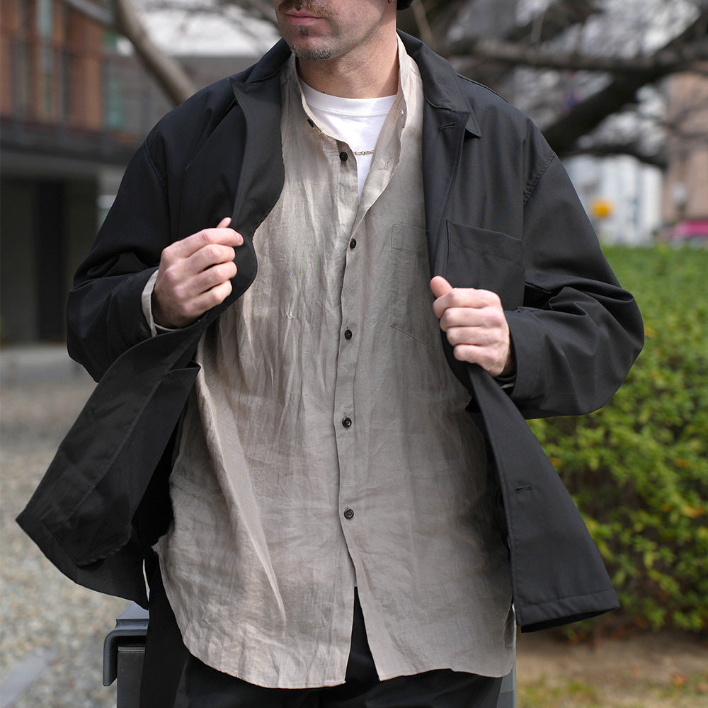 衿は小ぶりながらもややワイドに広げ、シルエットはゆとりのあるボックス型で、素材の落ち感を生かしたパターンが特徴です。
