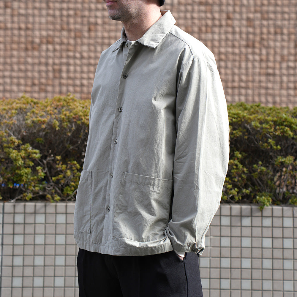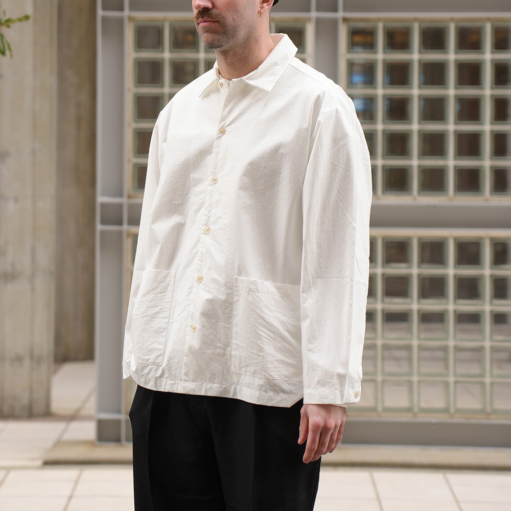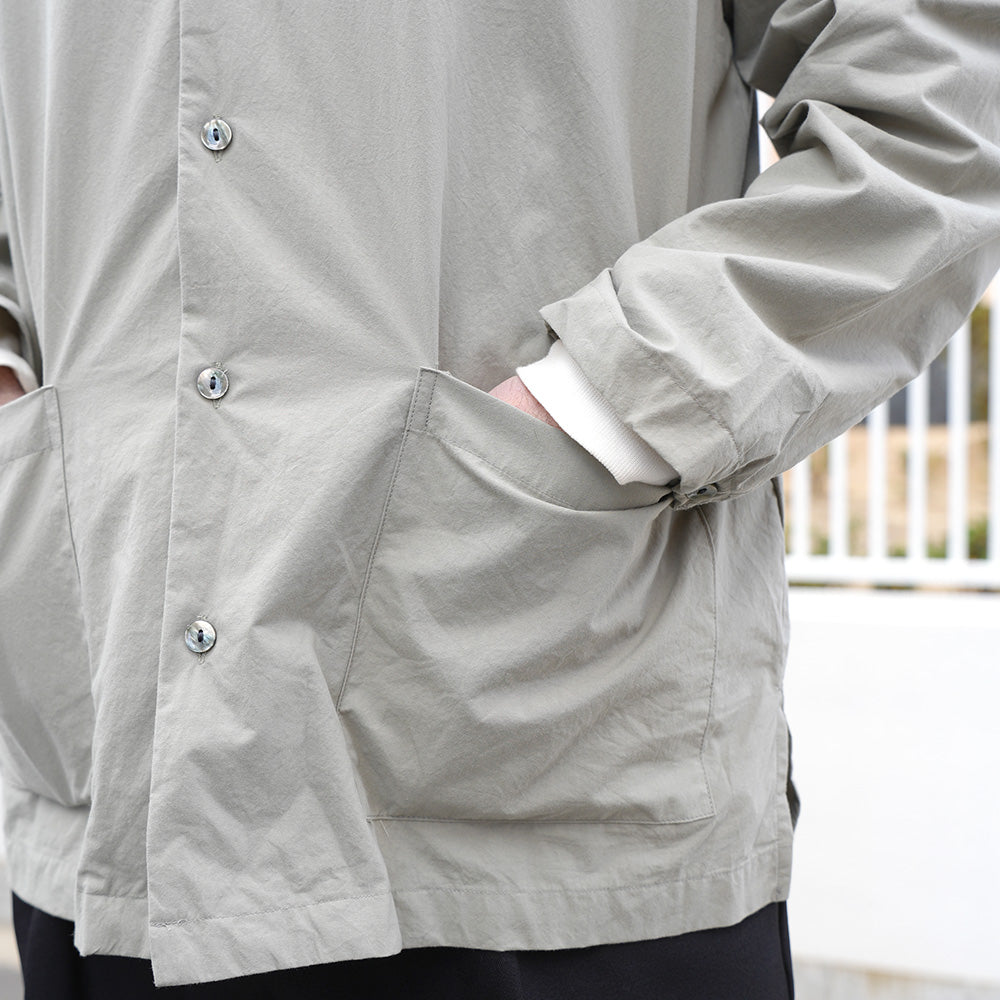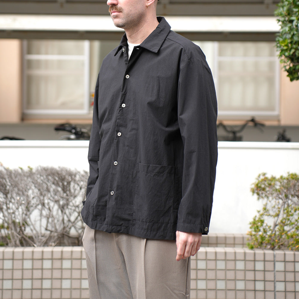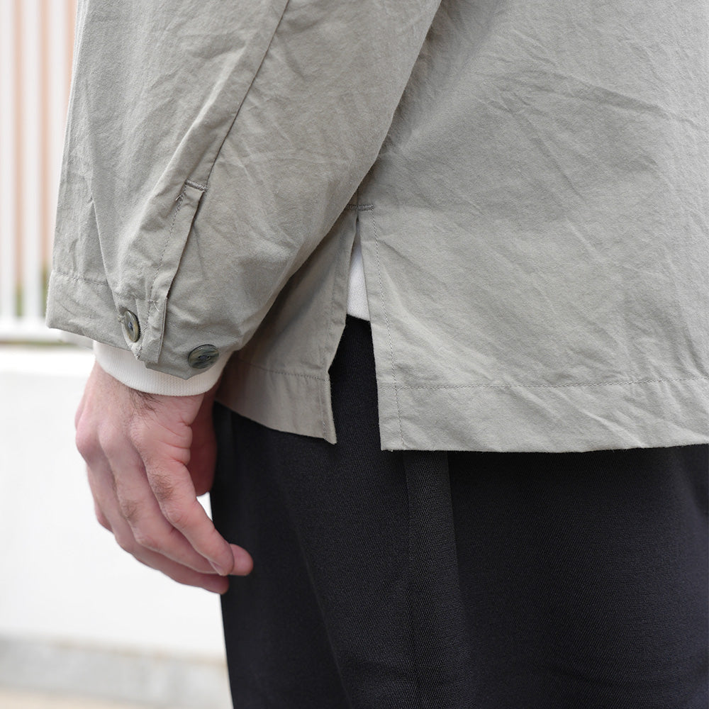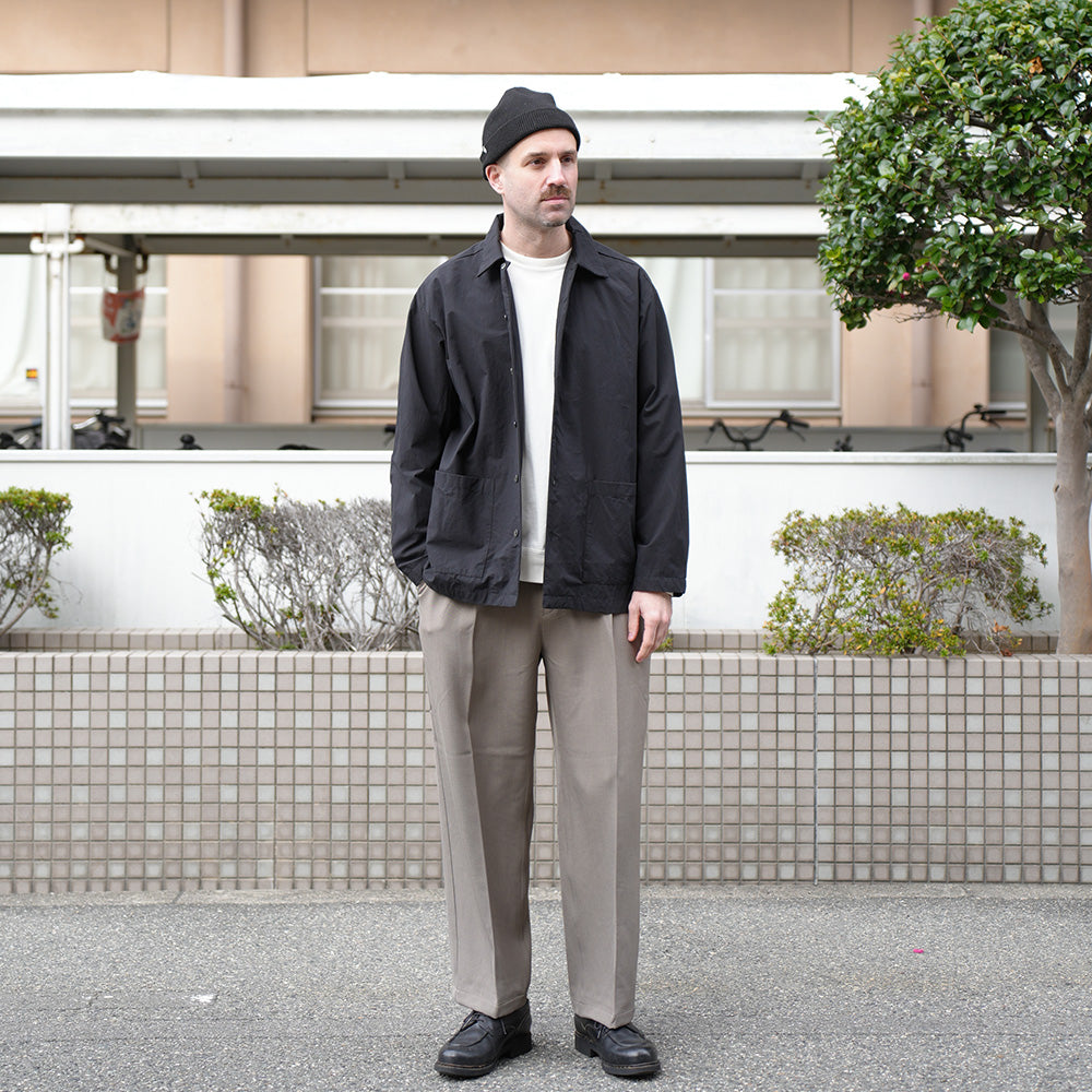 A shirt jacket made from high-density weatherproof fabric. It has a coverall-like feel and can be worn casually as outerwear from early spring.