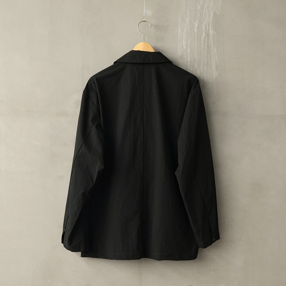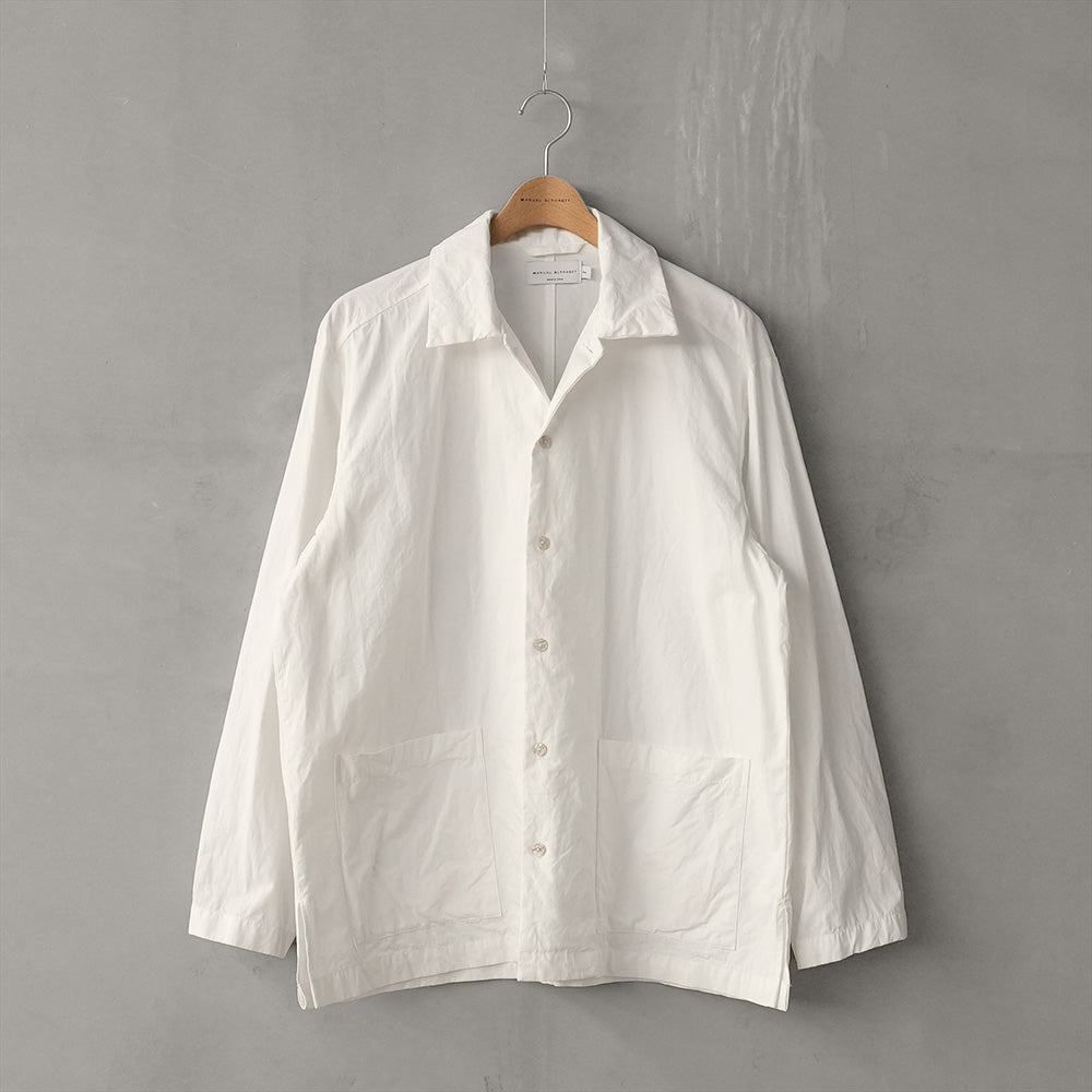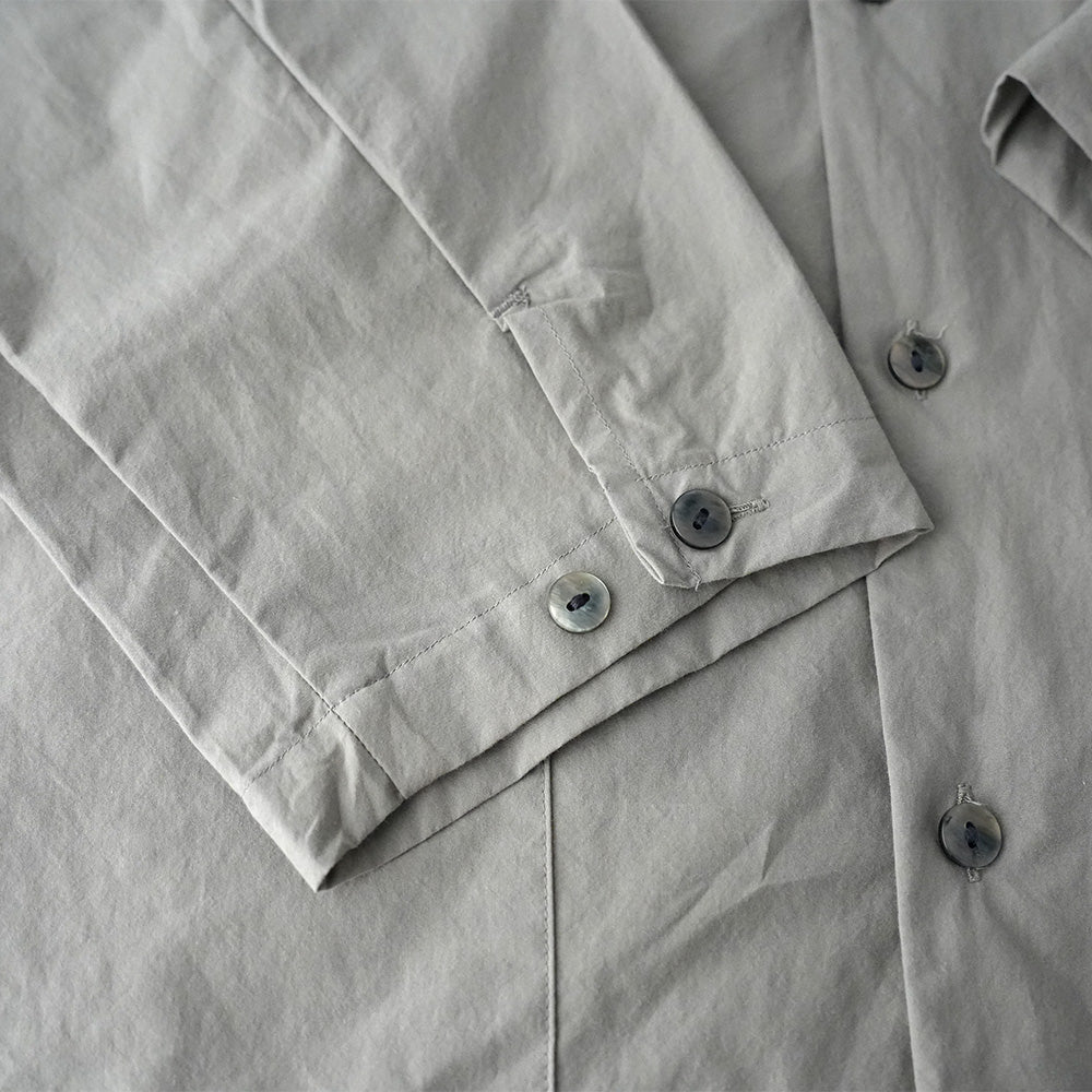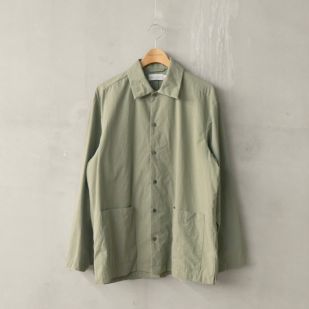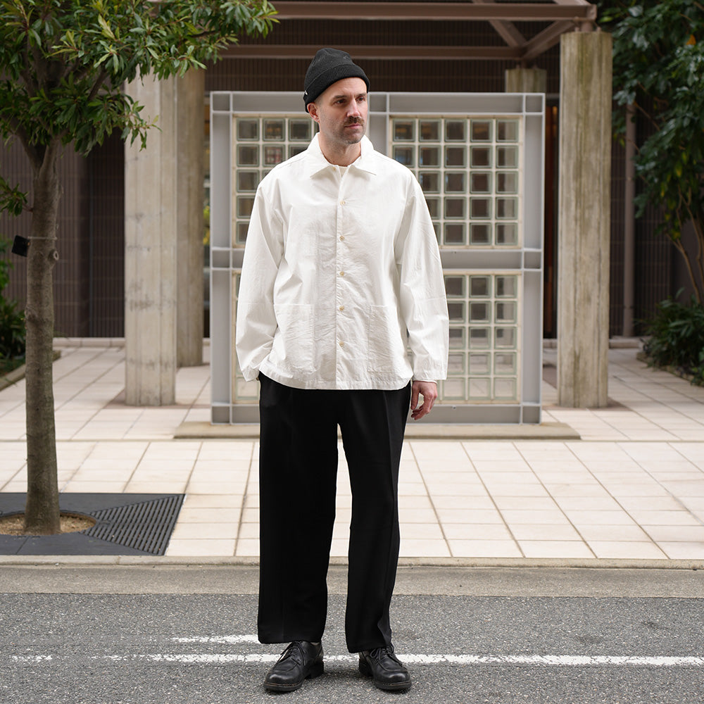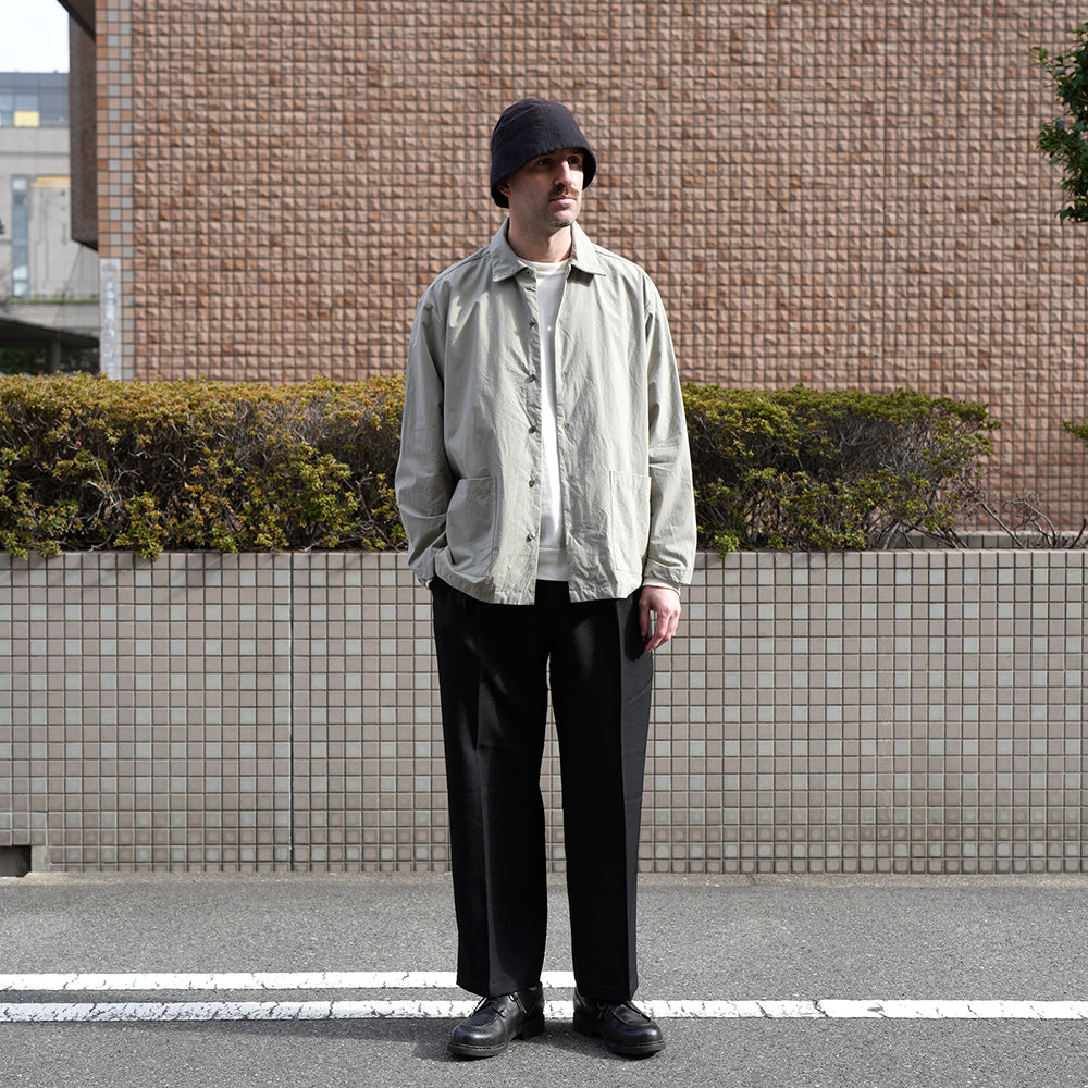 A shirt jacket made from high-density weatherproof fabric. It has a coverall-like feel and can be worn casually as outerwear from early spring.