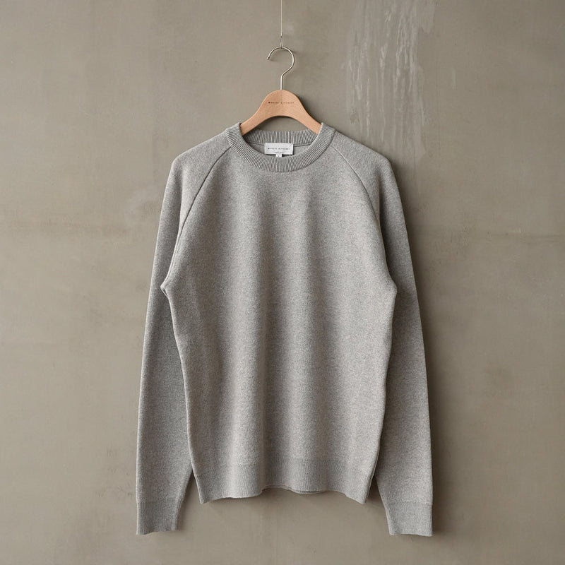 Cotton knit with raglan sleeves. It features a curved pattern sewn from the shoulder to the arm, creating a design that allows the arm to move